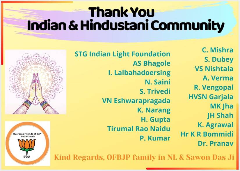 Indian culture has taught us to take care of everyone by helping and supporting each other without judgment/ prejudice and status. In May 2020, our amazing Indian diaspora i.e. our Hindustani and Indian community in Netherlands walk the talk on – “We are born to take care of each other and for spreading love”